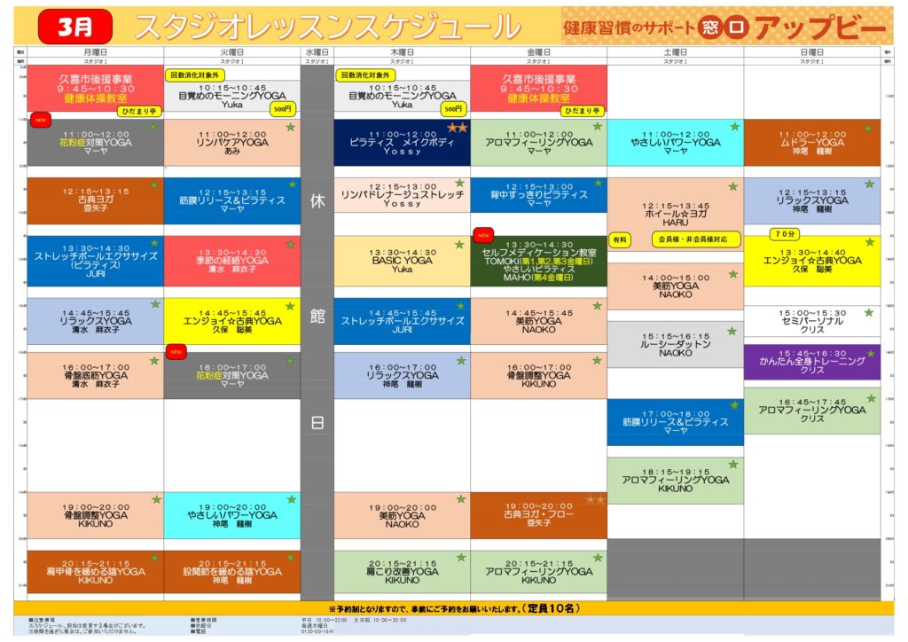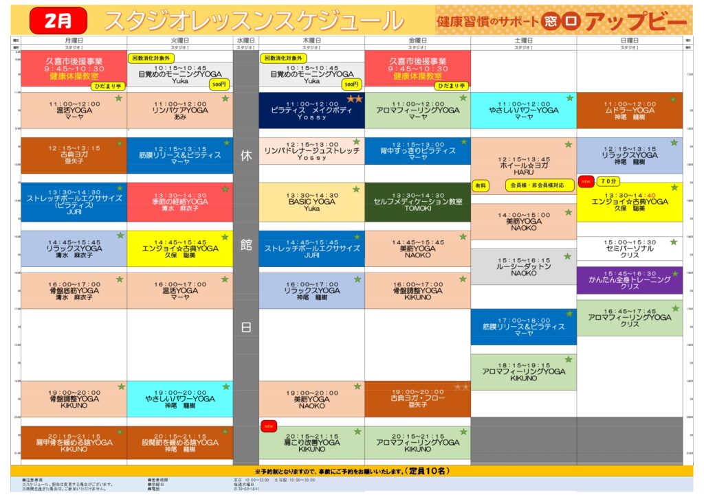 今月のプログラム 今月もさまざまなレッスンをご用意して、スタジオでお待ちしています! こちらのPDF版でご覧ください2月のプログラムからだすっきりヨガ習慣。 レッスン講座を知るレッスン講座代表的なレッスン講座の内容をご紹介!